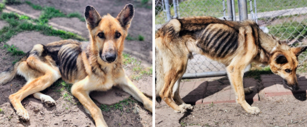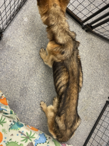 Just an hour ago, we rushed to help a severely emaciated, senior dog brought in by a partner high-intake shelter. Found on the side of the road, Aggie arrived at Houston Pets Alive! minutes ago, with one of the most severe cases of starvation we’ve ever seen, he’s a large dog and weighs only 38 pounds plus he’s heartworm positive—but he’s still fighting.