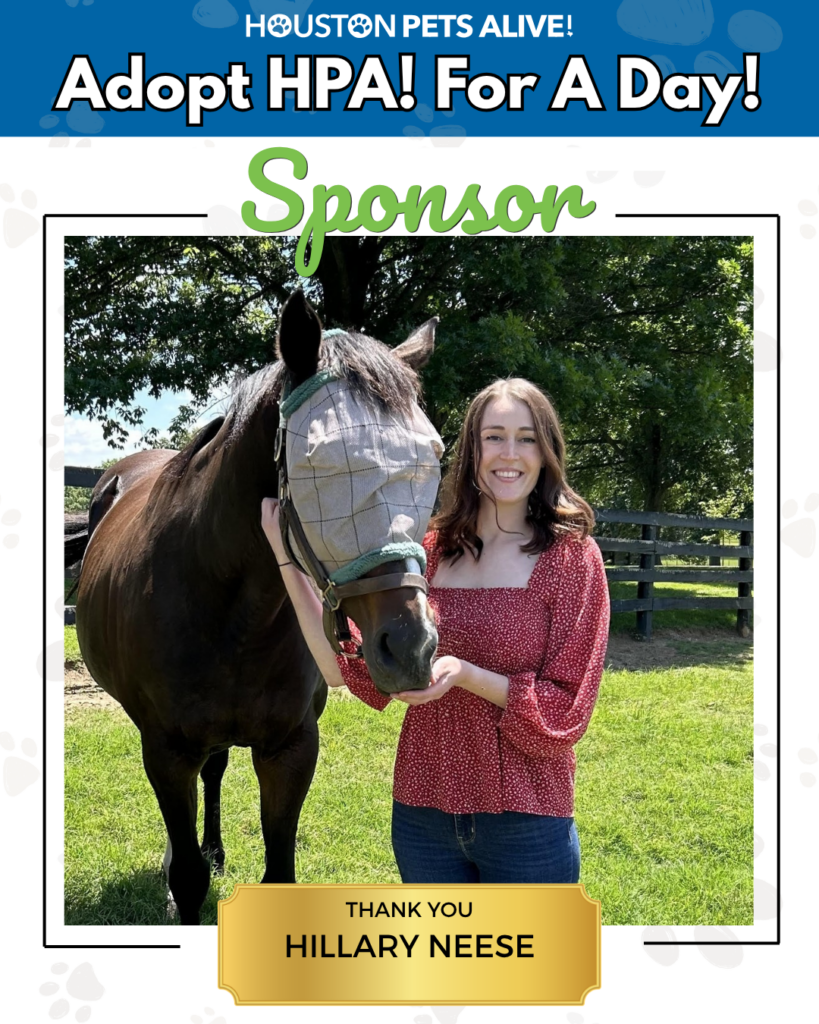 Thanks to their generous support, every pet at HPA! is receiving food, medical care, and love, all covered for the day. We’re grateful for their commitment to saving lives and helping at-risk animals find their way home. Shown here with their beloved pet, Rachel Alexandra, Hillary is making a real difference one paw at a time.
