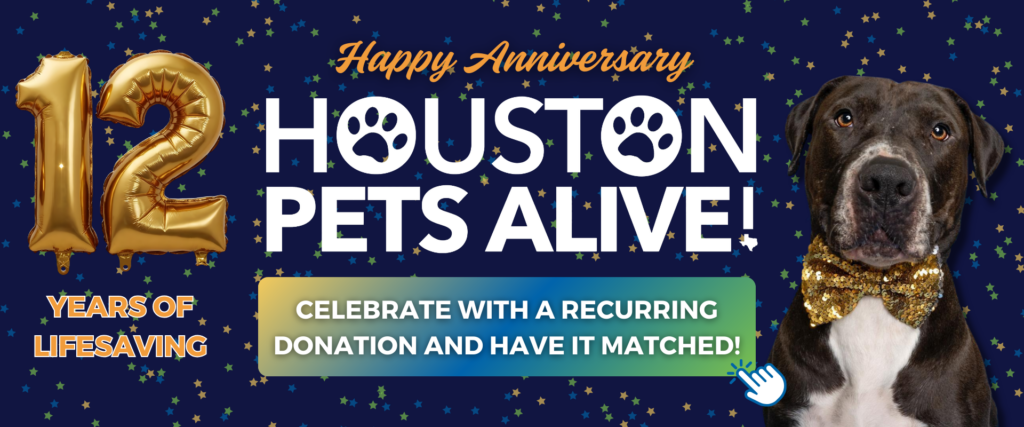 For 12 years, Houston Pets Alive! has been saving at-risk animals and giving them a second chance at life. To celebrate this milestone, we’re looking for 112 compassionate people to commit to $12 a month to sustain our lifesaving work.