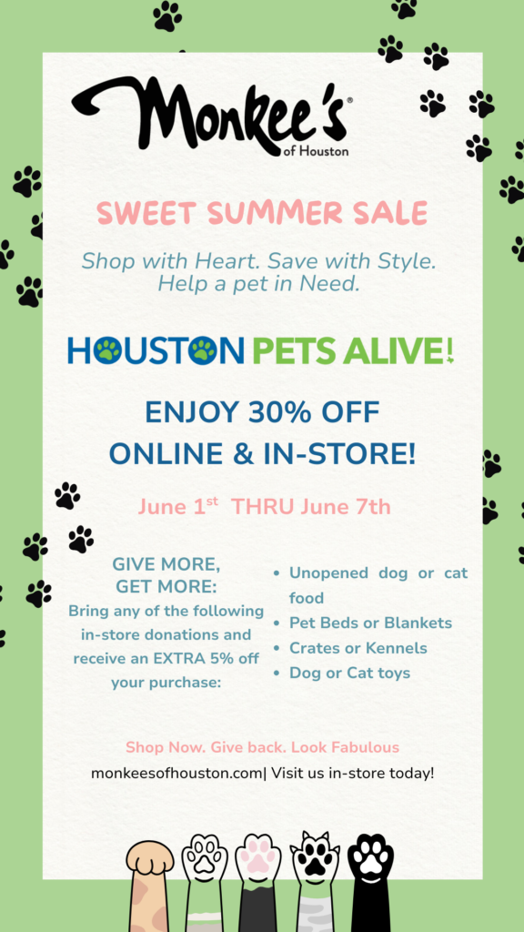 We’re excited to partner with Monkee’s of Houston for a Sweet Summer Sale benefiting Houston Pets Alive!